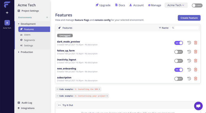 In 2021 you should stop pushing major updates to all users at the same time. Control their expectations and react to issues predictively by using feature flags. Simply integrate it with your framework by using SDK, then manage who should be allowed to have access to certain features.
